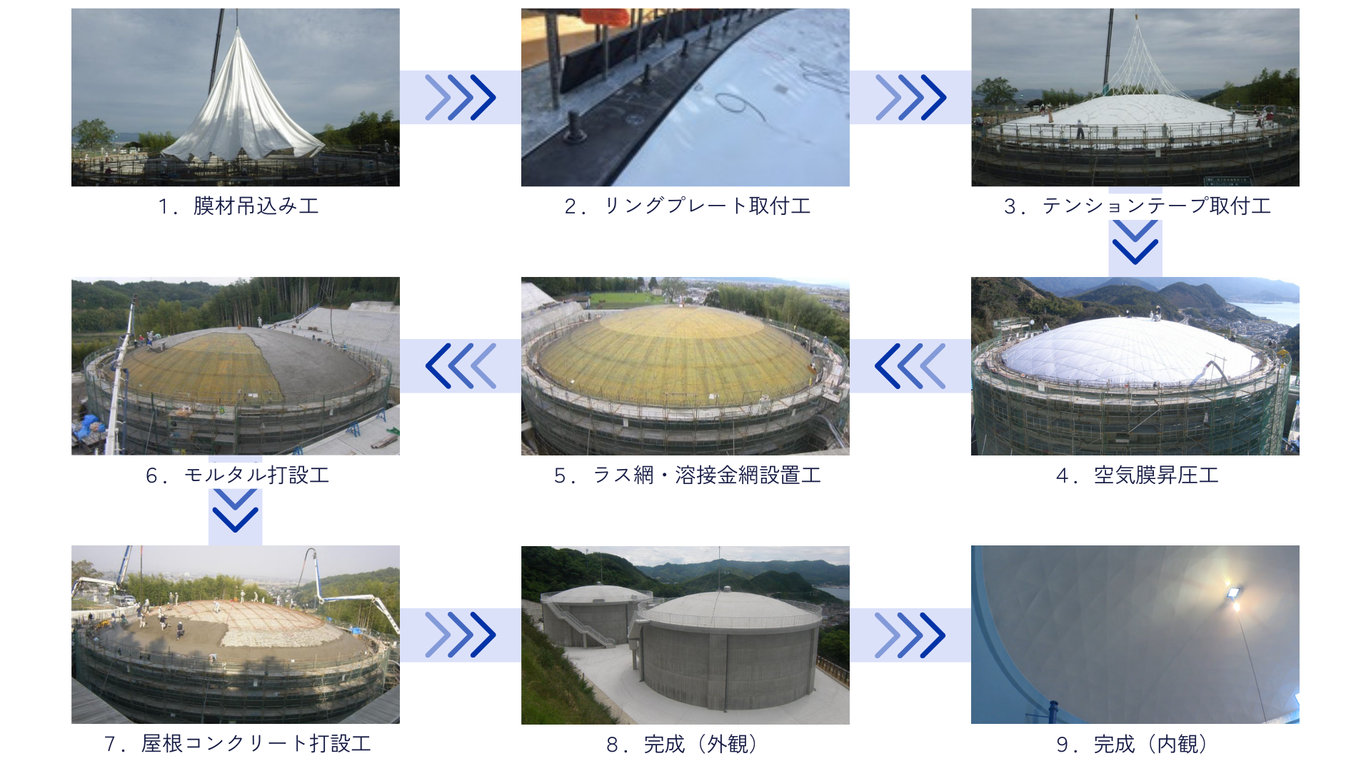| 施工方法 | ●型枠や支保工を必要としないため、作業の流れがスムーズです。 ●熟練工を必要としないため、労働力を大幅に削減できます。 ●型枠や支保工の資材の仮置き場が不要です。 ●膜材がそのままドーム裏面の防食層を兼ねているため、防食塗装工事が不要です。 | ●ドーム形状の型枠や支保工には、多くの資材と熟練した作業員を必要とします。 |